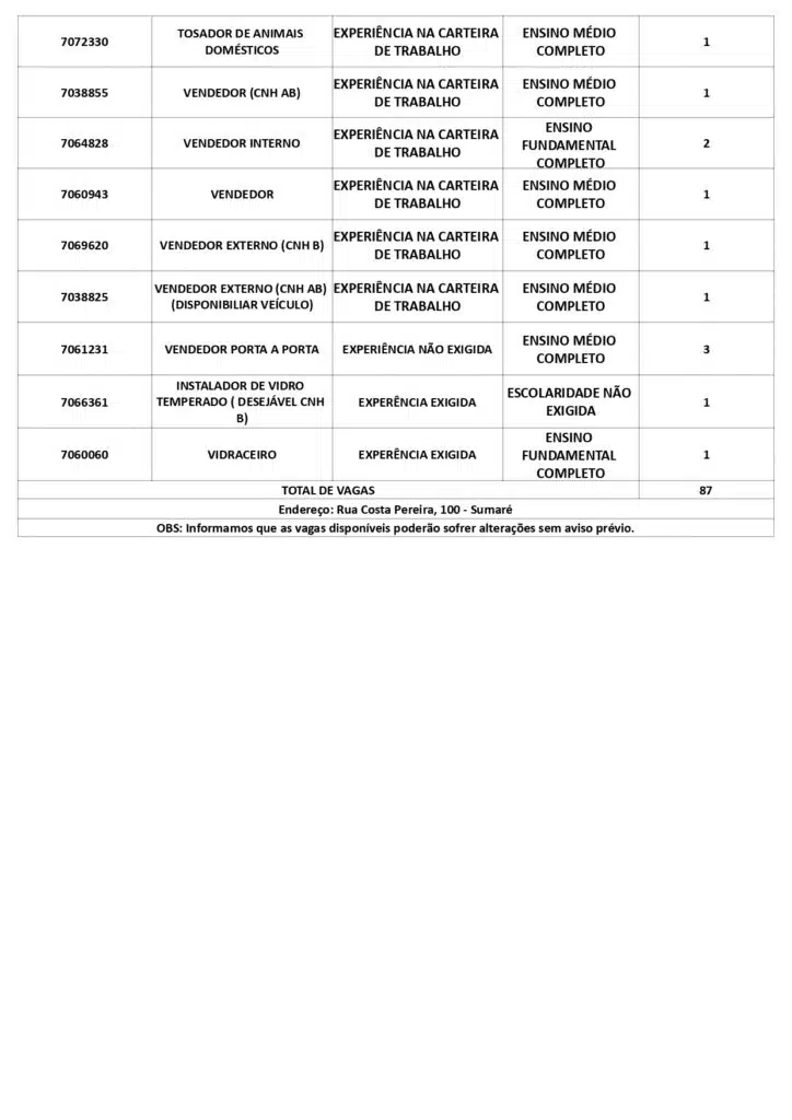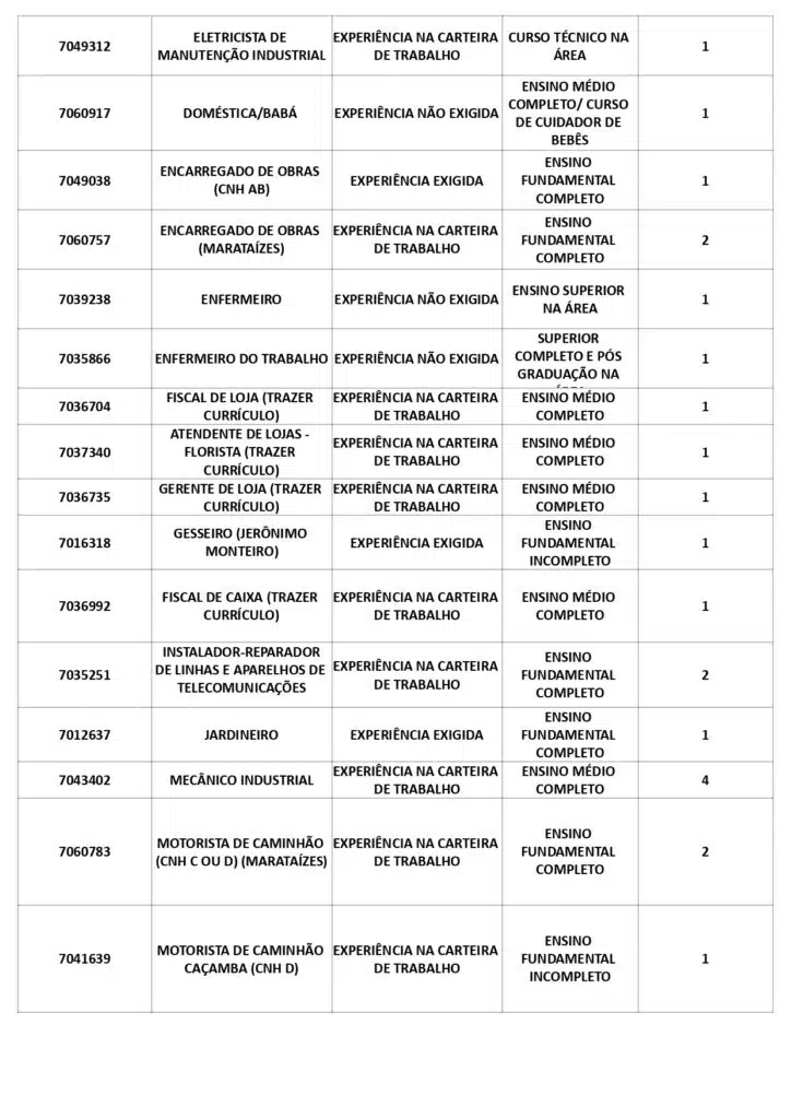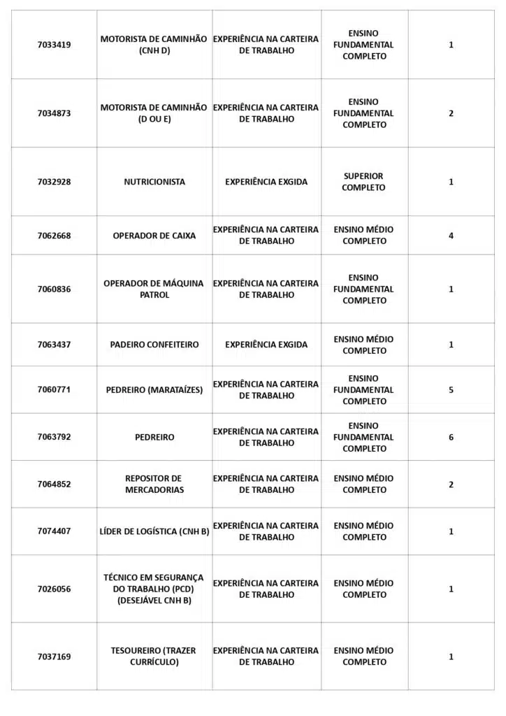 As oportunidades de emprego são para diversos cargos e níveis de escolaridade