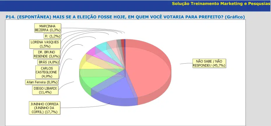 Já no contexto da metodologia espontânea, onde os nomes dos pré-candidatos não são apresentados como opções, o estudo do Instituto Solução aponta que o vereador Juninho Corrêa (PL) permanece na liderança, mas com 17,7% das intenções de voto.