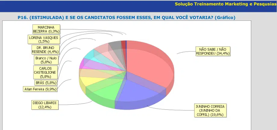 Na metodologia estimulada, onde os nomes dos pré-candidatos são apresentados como opções, o vereador Juninho Corrêa (PL) lidera o levantamento com 19,6% das intenções de voto.