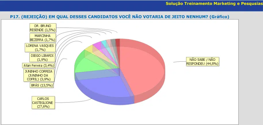 O vereador Juninho Corrêa (PL) aparece em terceiro lugar no índice de rejeição. Ele é descartado como opção por 3,9% dos eleitores, seguido por Allan Ferreira (Podemos), com 3,4%; Diego Libardi (Republicanos), com 1,9%; Lorena Vasquez e Marcia Bezerra, com 1,7% cada.