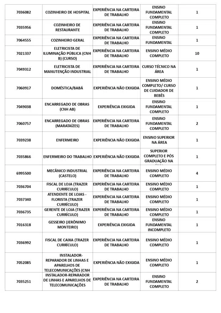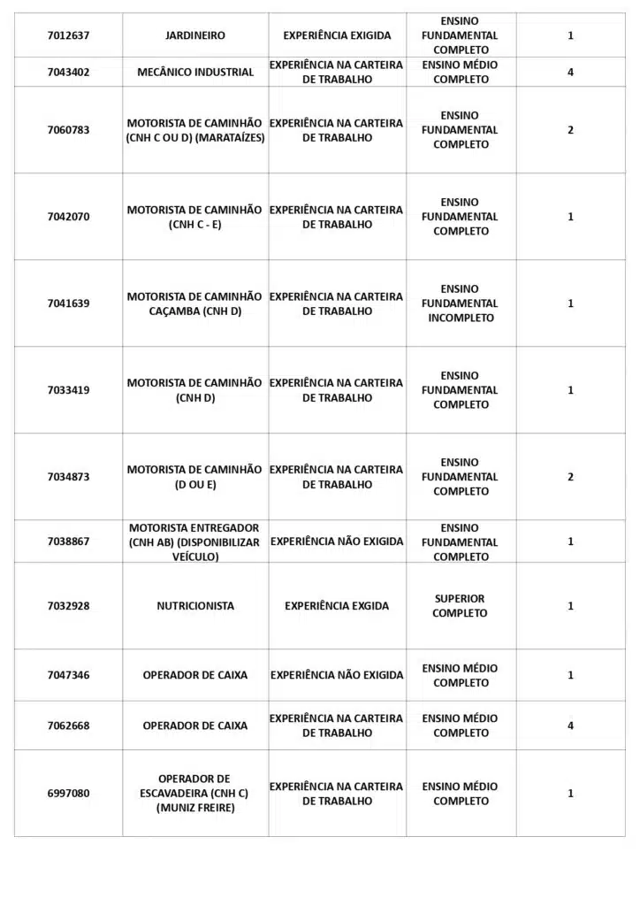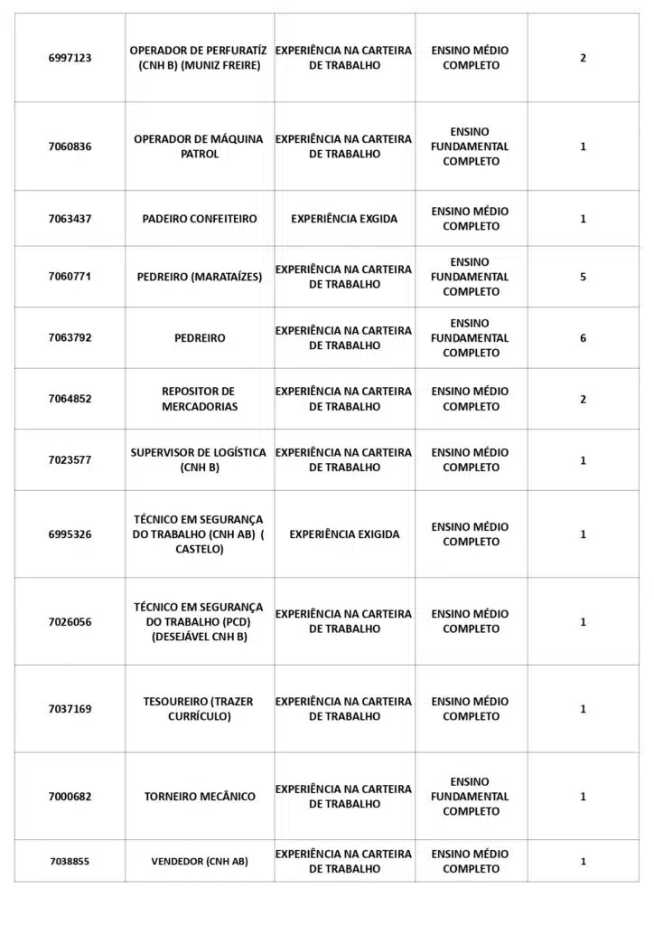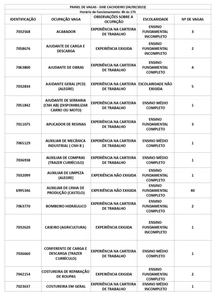 As oportunidades de emprego são para diversos cargos e níveis de escolaridade e para cidades do Sul do ES. No entanto, é preciso fazer um cadastro no Sine Cachoeiro para concorrê-las.