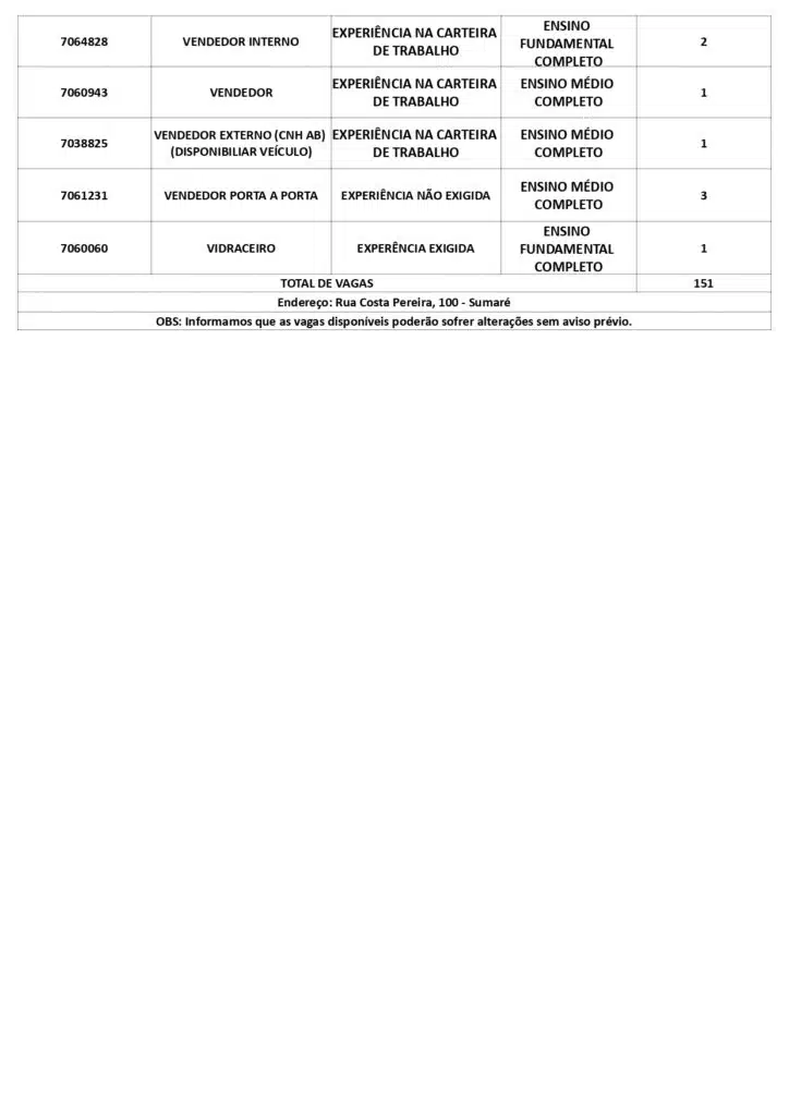 As oportunidades de emprego são para diversos cargos e níveis de escolaridade