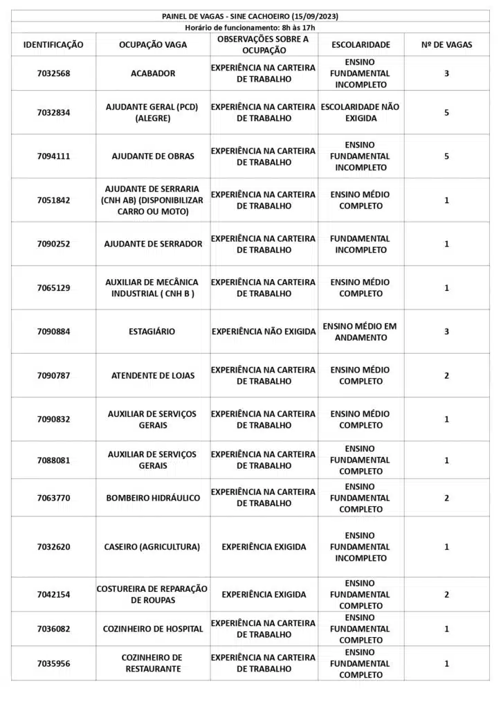 As oportunidades de emprego são para diversos cargos e níveis de escolaridade e para cidades do Sul do ES. No entanto, é preciso fazer um cadastro no Sine Cachoeiro para concorrê-las.