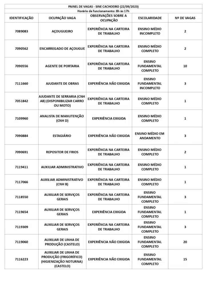 Receba as principais notícias no seu WhatsApp! clique aquiAs oportunidades de emprego são para diversos cargos e níveis de escolaridade e para cidades do Sul do ES. No entanto, é preciso fazer um cadastro no Sine Cachoeiro para concorrê-las.