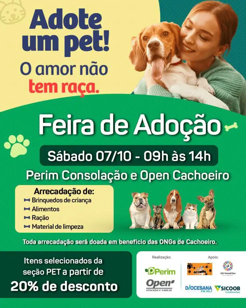 No sábado (7), a partir das 9h, voluntários estarão no Open Atacado e Varejo e no Perim Supermercados com os mais lindos aumiguinhos disponíveis das Ongs de Cachoeiros e também do Centro de Controle de Zoonoses da cidade (CCZ). Quem se encantar por um, pode realizar a adoção responsável desde que esteja munido de Documento com foto, comprovante de residência, fotos e vídeos registrados no seu celular do local onde o pet irá ficar.