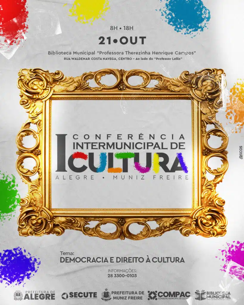 A Prefeitura Municipal de Alegre, por meio da SECUTE – Secretaria Executiva de Cultura, Turismo e Esportes, COMPAC – Conselho Municipal de Cultura e a Prefeitura de Muniz Freire, convidam todos para participarmos juntos da I Conferência Intermunicipal de Cultura de Alegre e Muniz Freire.