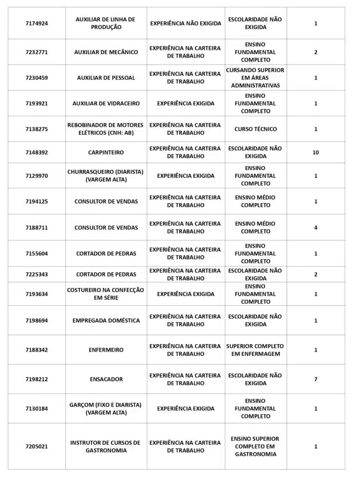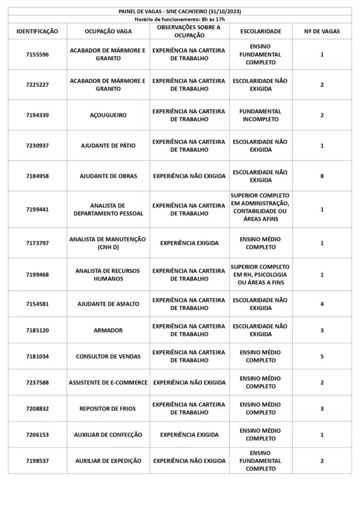 Receba as principais notícias no seu WhatsApp! clique aquiAs oportunidades de emprego são para diversos cargos e níveis de escolaridade e para cidades do Sul do ES. No entanto, é preciso fazer um cadastro no Sine Cachoeiro para concorrê-las.