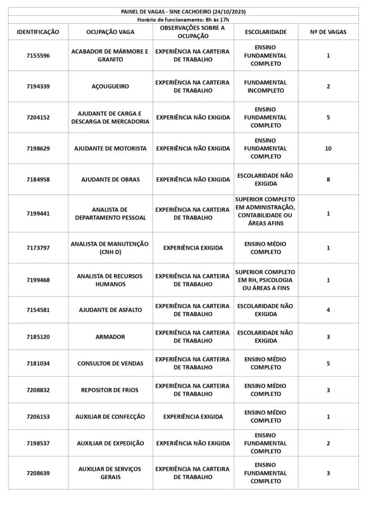 As oportunidades de emprego são para diversos cargos e níveis de escolaridade e para cidades do Sul do ES. No entanto, é preciso fazer um cadastro no Sine Cachoeiro para concorrê-las.