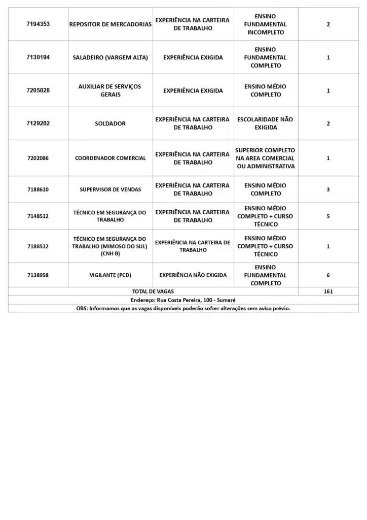 As oportunidades de emprego são para diversos cargos e níveis de escolaridade