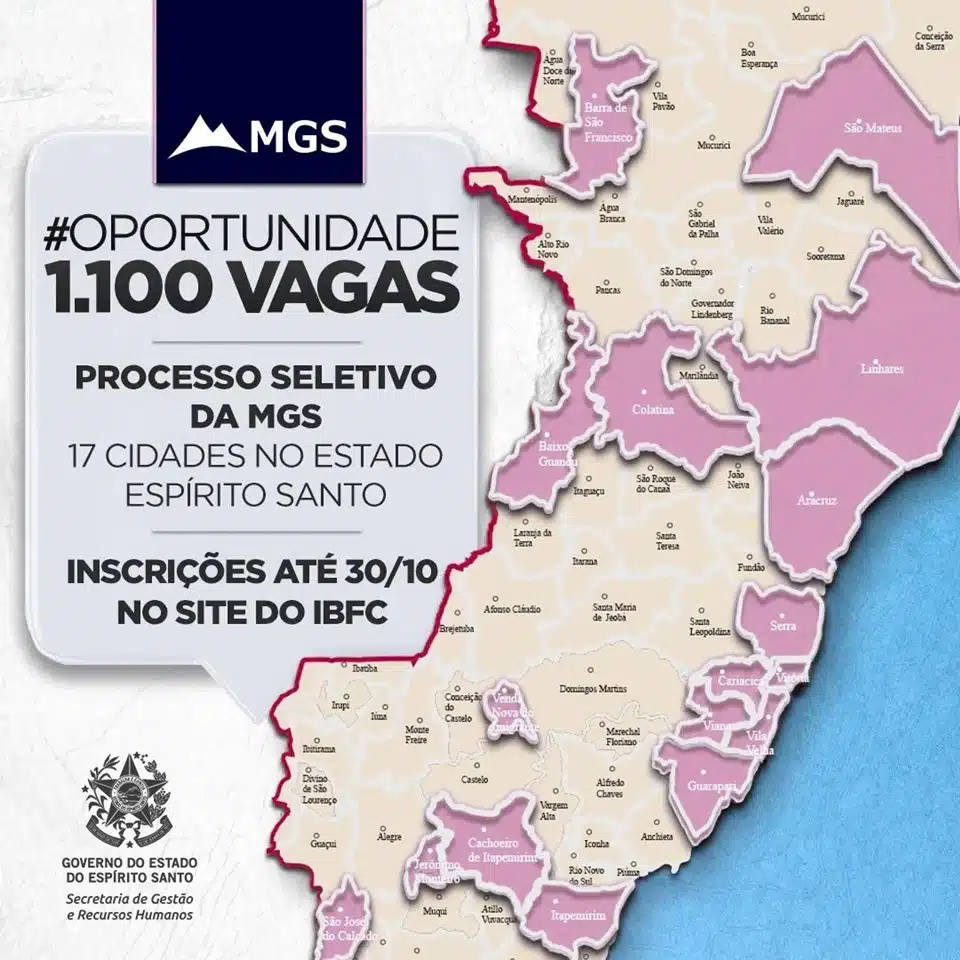 Estão abertas pelo site www.concursos.ibfc.org.br as inscrições para o Processo Seletivo Público Simplificado (PSPS) 05/23, que visa ao preenchimento de 1.100 vagas para o cargo de Assistente Administrativo. As oportunidades são para atuar em órgãos do Governo do Estado, em 17 cidades. (acompanhe no mapa abaixo). A saber, para Cachoeiro de Itapemirim são 42 vagas.