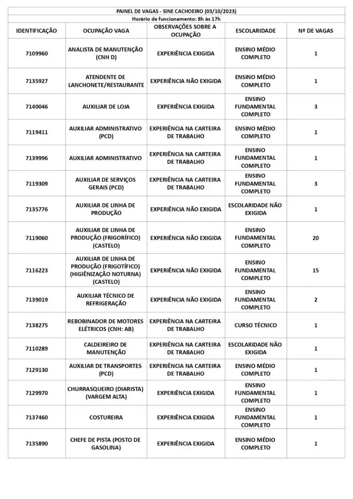 Receba as principais notícias no seu WhatsApp! clique aquiAs oportunidades de emprego são para diversos cargos e níveis de escolaridade e para cidades do Sul do ES. No entanto, é preciso fazer um cadastro no Sine Cachoeiro para concorrê-las.