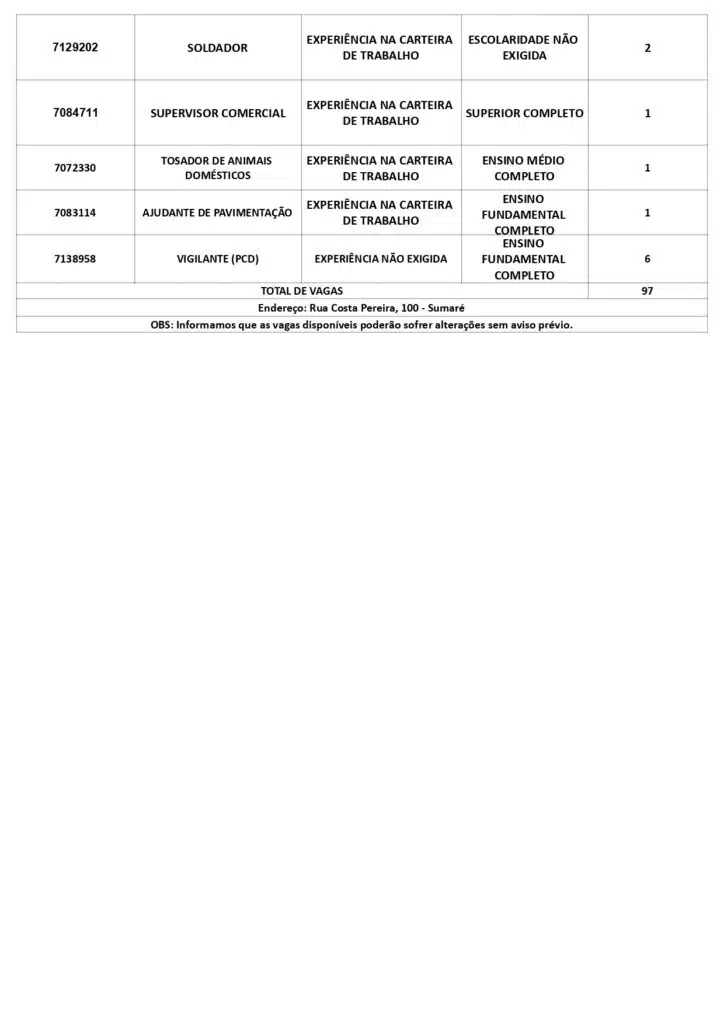As oportunidades de emprego são para diversos cargos e níveis de escolaridade