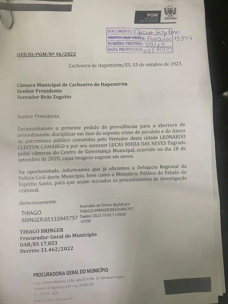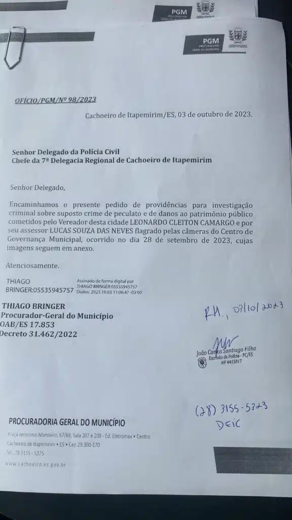 A Prefeitura de Cachoeiro de Itapemirim, por meio da Procuradoria Geral do Município (PGM), entrou com um pedido de investigação no Ministério Público Estadual (MP-ES) contra o vereador Leonardo Cleiton Camargo (PL) e um assessor, suspeitos de terem cometido o crime de peculato e de danos ao patrimônio público.
