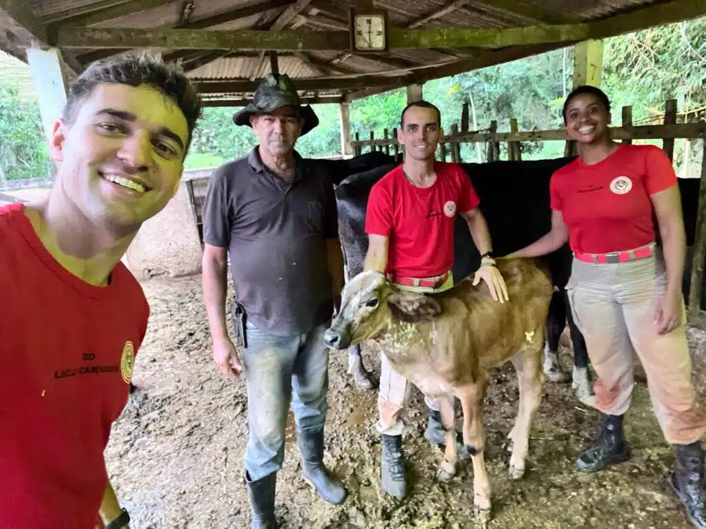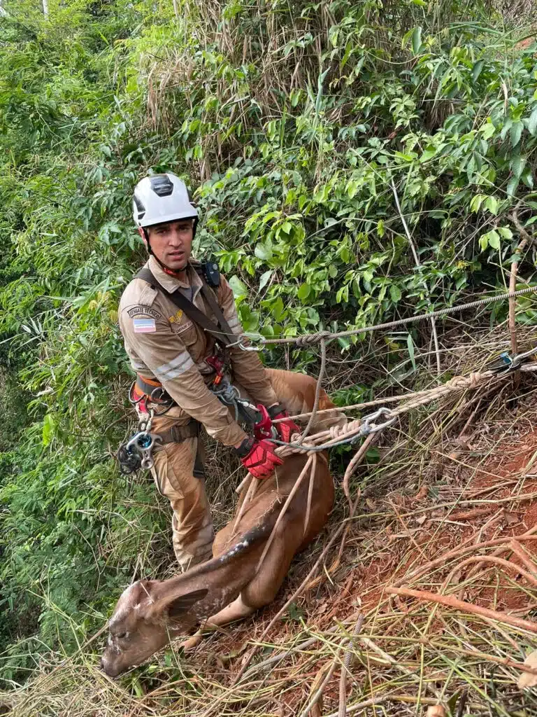 Receba as principais notícias no seu WhatsApp! clique aquiDe acordo com os bombeiros, a equipe foi acionada pelo dono do animal, informando que o bezerro havia se desequilibrado e caído em uma grota de pedra, dentro de mata densa. Ele informou, ainda, que ouvia o mugido do animal, porém, não conseguia resgatar por conta de um penhasco.