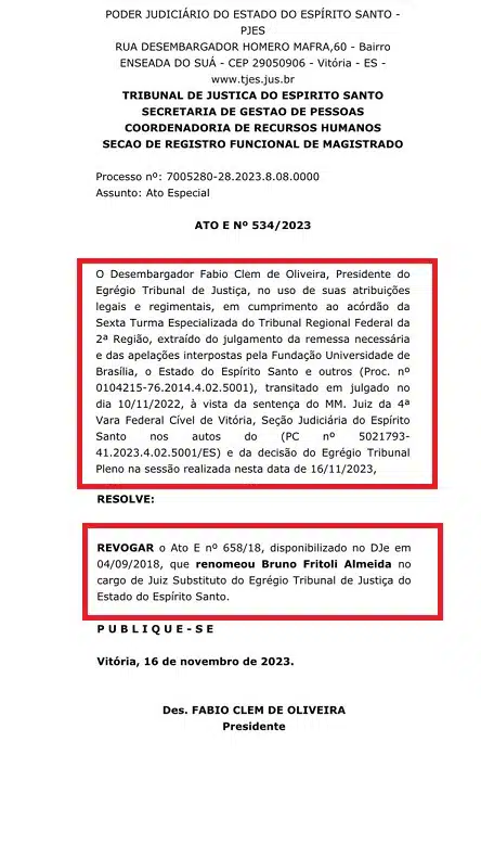 O Tribunal de Justiça do Espirito Santo (TJ-ES) reconheceu a ausência de título para a manutenção de Bruno Fritoli Almeida no cargo de juiz. A decisão foi proferida pelo presidente do TJES, nesta quinta-feira (16), na 33ª sessão do Tribunal Pleno.