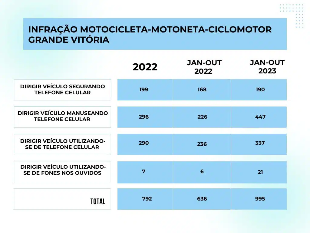 O uso do celular por condutores em motocicleta, motoneta ou ciclomotor foi flagrado por agentes de trânsito 1.463 vezes no Estado de janeiro a outubro de 2023, sendo 995 autuações só nos municípios da Grande Vitória. Os dados já superam o mesmo período do ano passado no Estado, quando foram 1.260 autuações. Na Grande Vitória, os dados superam todo o ano de 2022, quando foram 792 autuações.