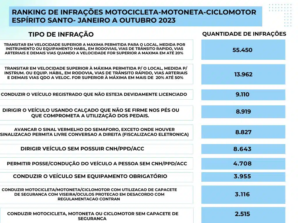 Além dos perigos do celular, a campanha também aborda outras condutas de risco para os motociclistas. O ranking de infrações registradas especificamente para motocicletas, motonetas e ciclomotores no Estado mostra que muitos condutores fazem escolhas que colocam em risco a própria vida, já que estão mais expostos ao perigo em um veículo de duas rodas, e das demais pessoas nas vias. Confira o ranking: