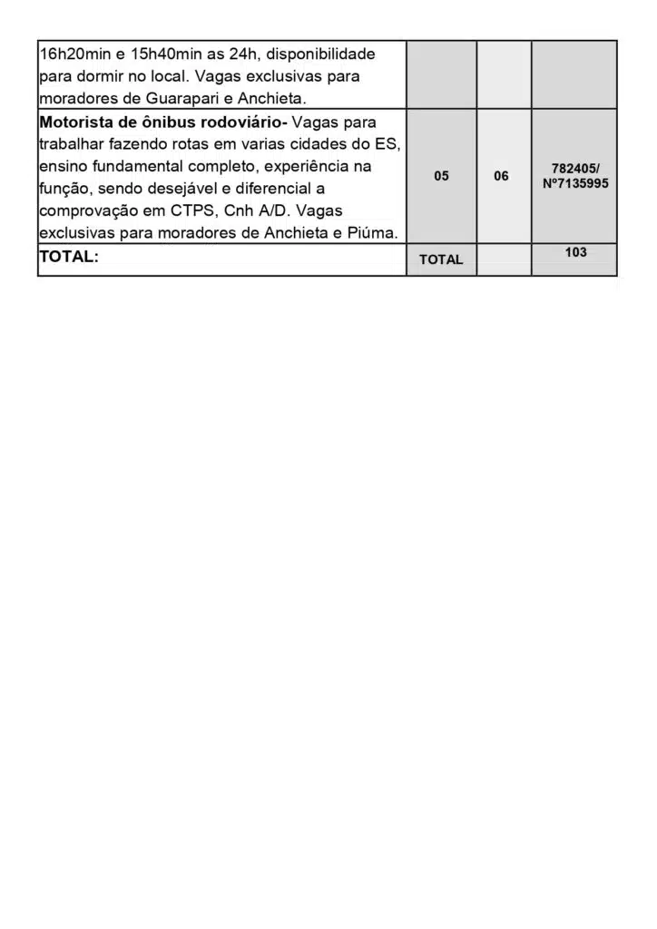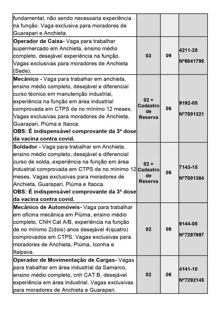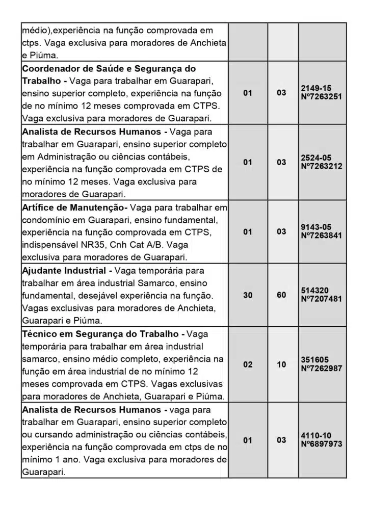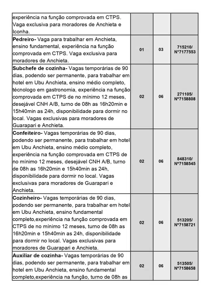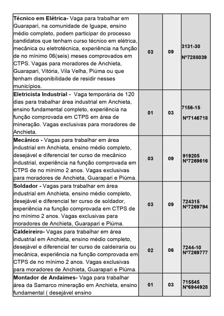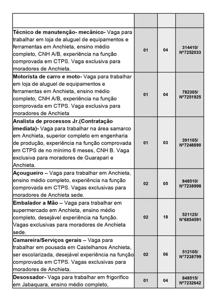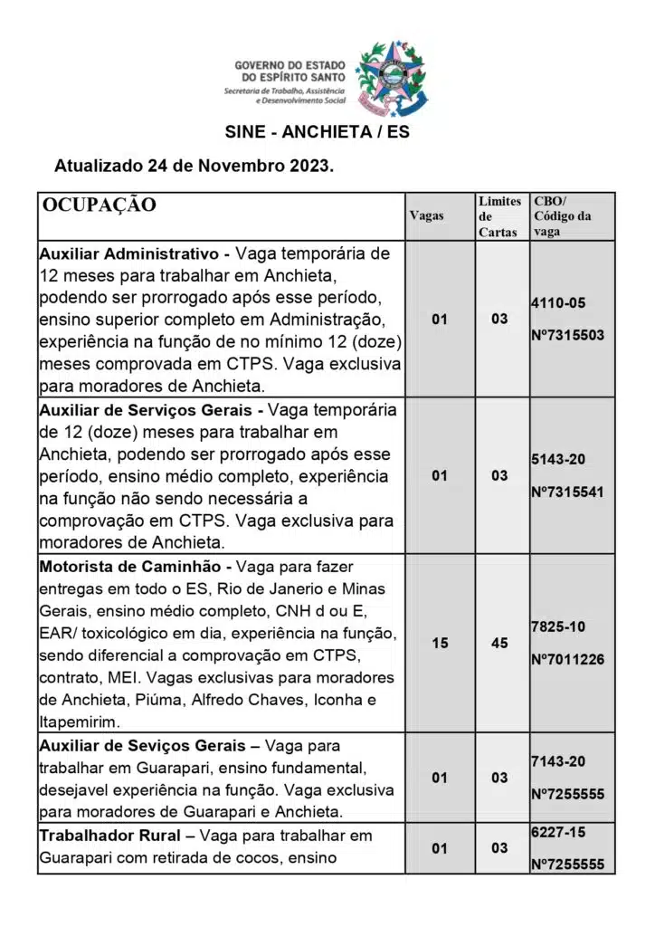 Ainda segundo o Sine Anchieta, as vagas de empregos poderão sofrer alteração sem aviso prévio. Além disso, para cada oportunidade, há um limite de encaminhamento especificado pela empresa.
