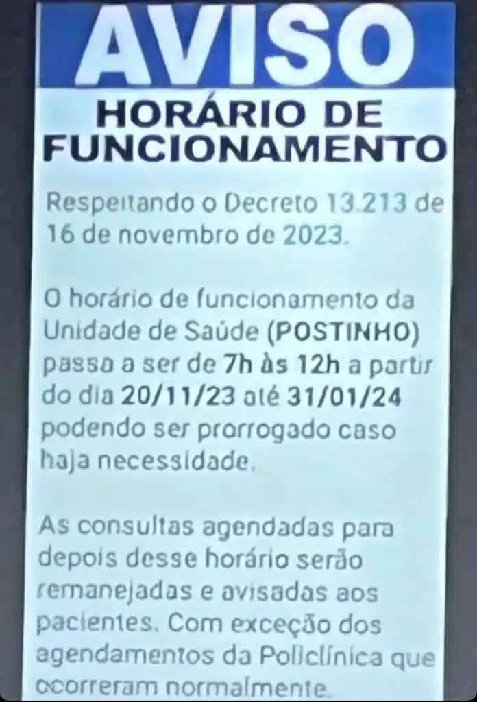 “O horário de funcionamento da Unidade de Saúde (POSTINHO) passou a ser de 7h às 12h a partir do dia 20/11/23 até 31/01/24 podendo ser prorrogado caso haja necessidade. As consultas agendadas para depois desse horário serão remanejadas e avisadas aos pacientes. Com exceção dos agendamentos da Policlínica que ocorreram normalmente”, diz o comunicado.