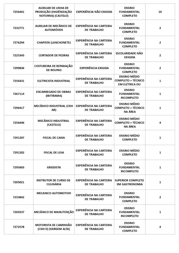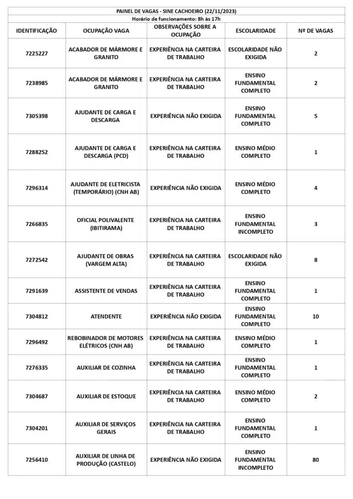 Receba as principais notícias no seu WhatsApp! clique aquiAs oportunidades de emprego são para diversos cargos e níveis de escolaridade e para cidades do Sul do ES. No entanto, é preciso fazer um cadastro no Sine Cachoeiro para concorrê-las.