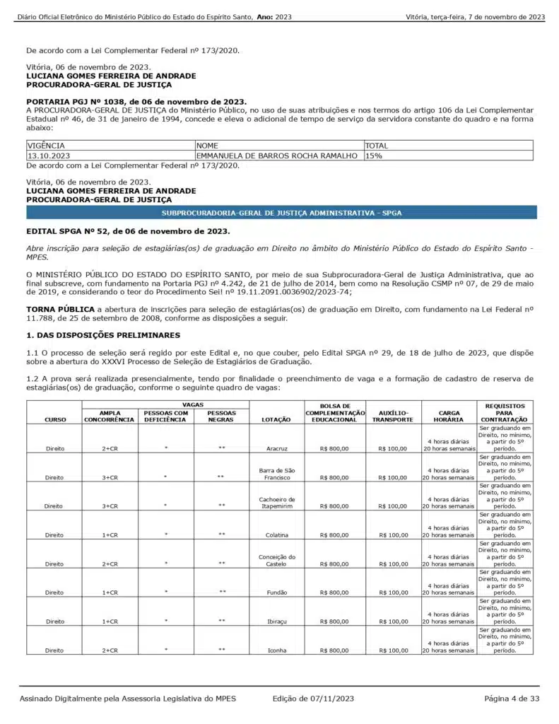 O Ministério Público do Estado do Espírito Santo (MPES) abriu inscrições para estágio em Direito, para unidades da instituição em 68 municípios.