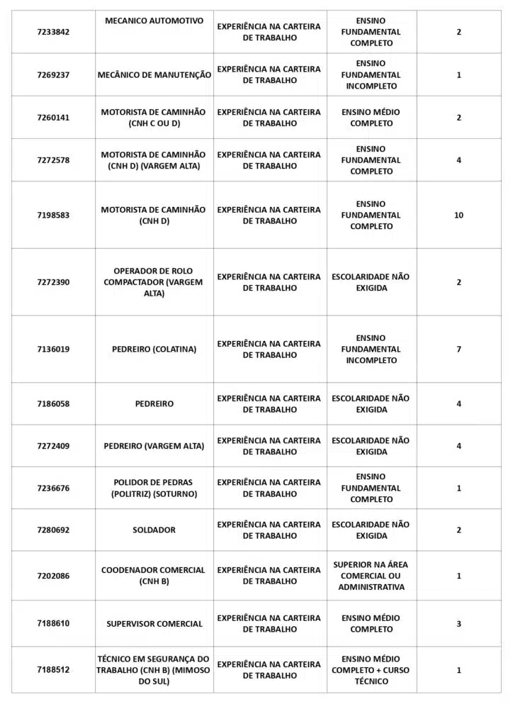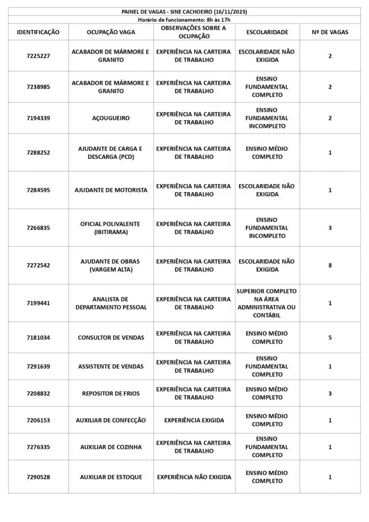 As oportunidades de emprego são para diversos cargos e níveis de escolaridade e para cidades do Sul do ES. No entanto, é preciso fazer um cadastro no Sine Cachoeiro para concorrê-las.