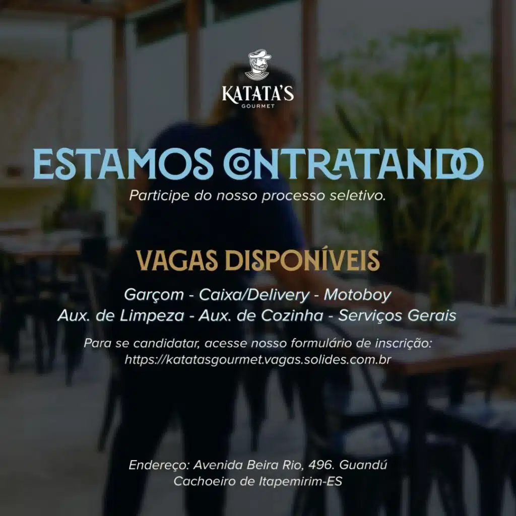 O Katatas Gourmet, restaurante de Cachoeiro de Itapemirim especializado em frutos do mar, está com processo seletivo aberto para contratação de novos colaboradores. Há oportunidades para garçom, caixa, motoboy, auxiliar de limpeza, auxiliar de cozinha e serviços gerais.