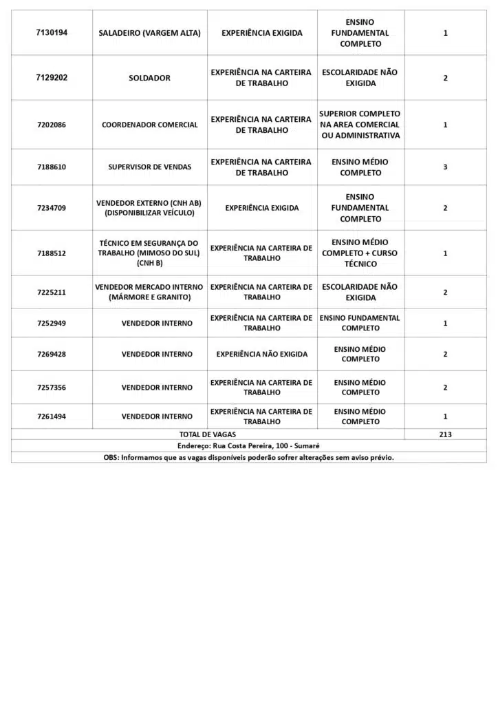 As oportunidades de emprego são para diversos cargos e níveis de escolaridade