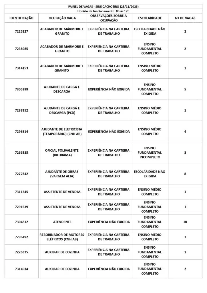 Receba as principais notícias no seu WhatsApp! clique aquiAs oportunidades de emprego são para diversos cargos e níveis de escolaridade e para cidades do Sul do ES. No entanto, é preciso fazer um cadastro no Sine Cachoeiro para concorrê-las.