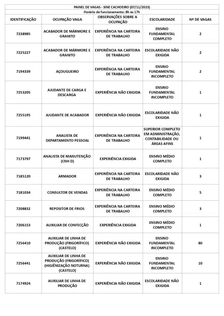 Receba as principais notícias no seu WhatsApp! clique aquiAs oportunidades de emprego são para diversos cargos e níveis de escolaridade e para cidades do Sul do ES. No entanto, é preciso fazer um cadastro no Sine Cachoeiro para concorrê-las.