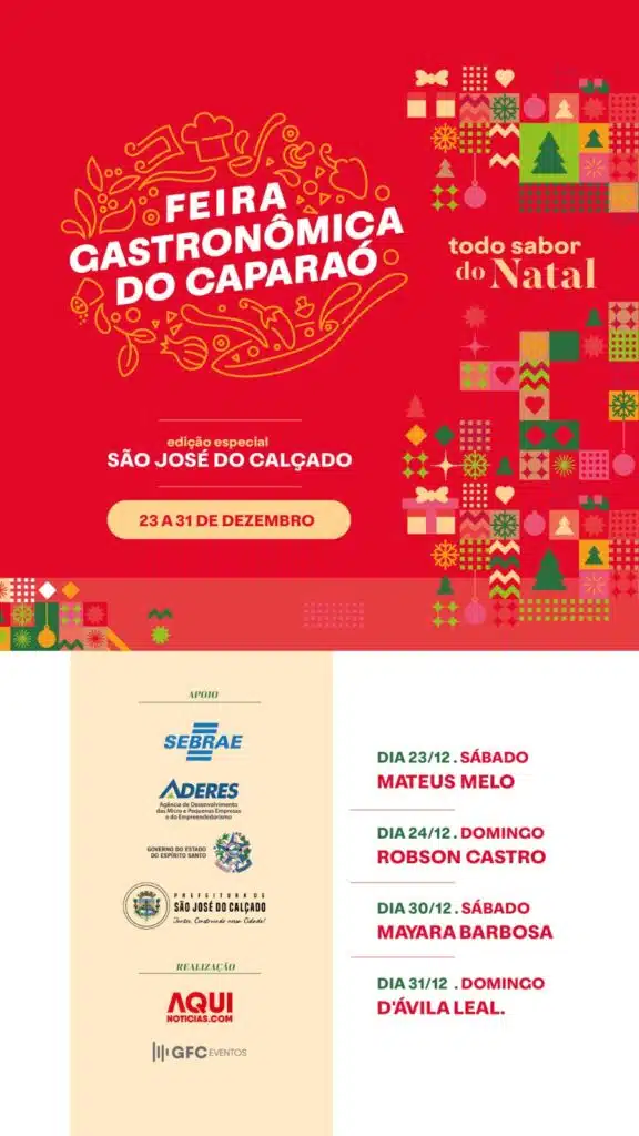 A segunda edição da Feira Gastronômica do Caparaó “todo sabor do Natal” começa neste sábado (23) em São José do Calçado. O evento é uma iniciativa da GFC Eventos e a Prefeitura do município. O evento conta com o apoio do Governo do Estado do Espírito Santo, Aderes, Sebrae e AQUINOTICIAS.COM.