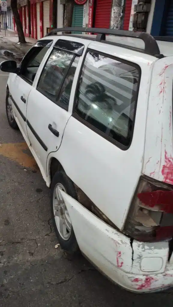 Diante disso, no local, os guardas avistaram dois veículos abandonado na rua. O veículo, um Volkswagen Parati, branca, estava com a parte traseira dentro da loja. Além disso, o veículo estava com marcas de tinta vermelha na traseira, que dava indícios de que havia sido usado para derrubar a porta.