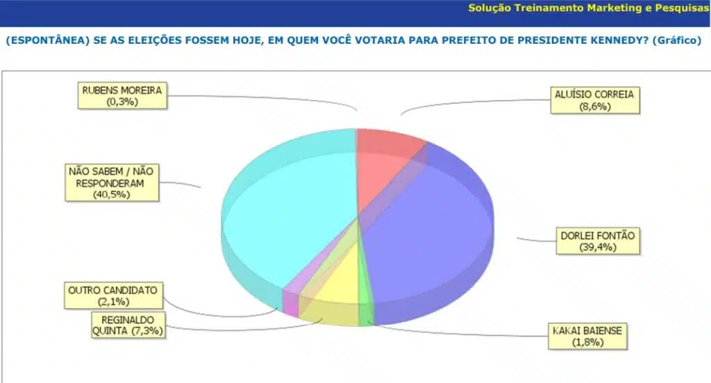 No contexto da metodologia espontânea, onde os nomes dos pré-candidatos não são apresentados como opções, o chefe do Poder Executivo de Kennedy, Dorlei Fontão, também se destaca em primeiro lugar com 39,4% das intenções de votos.