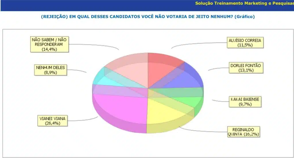 O Instituto Solução ainda perguntou aos eleitores em quais desses pré-candidatos eles não votariam de jeito nenhum. Nessa pergunta, quem lidera é o pré-candidato Vianei Viana, com 26,4%. Ele é seguido por Reginaldo Quinta, com 16,2%; Dorlei Fontão, com 13,1%; Aluísio Correia, com 11,5% e Kakai Baiense, com 9,7%.