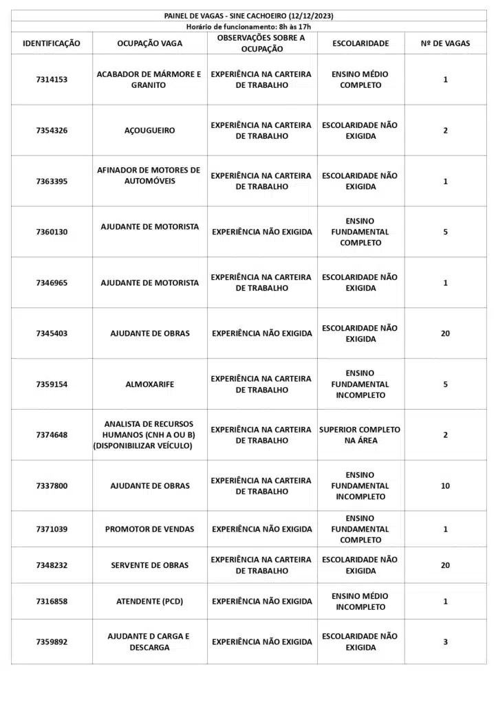 Receba as principais notícias no seu WhatsApp! clique aquiAs oportunidades de emprego são para diversos cargos e níveis de escolaridade. No entanto, é preciso fazer um cadastro no Sine Cachoeiro para concorrê-las.