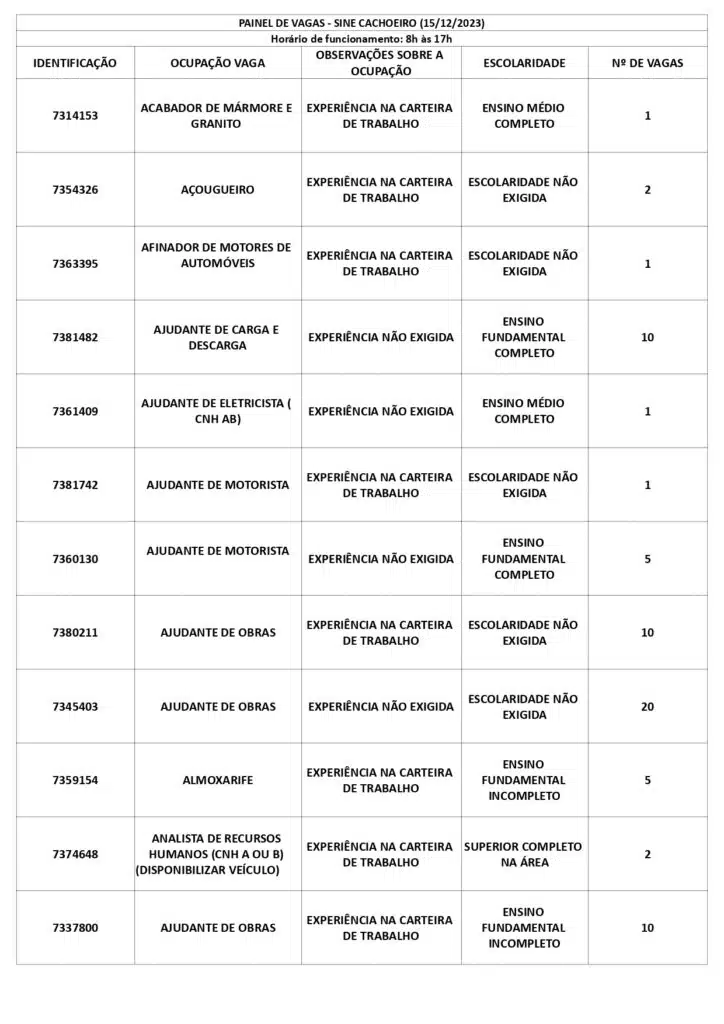 Receba as principais notícias no seu WhatsApp! clique aquiAs oportunidades de emprego são para diversos cargos e níveis de escolaridade e para cidades do Sul do ES. No entanto, é preciso fazer um cadastro no Sine Cachoeiro para concorrê-las.