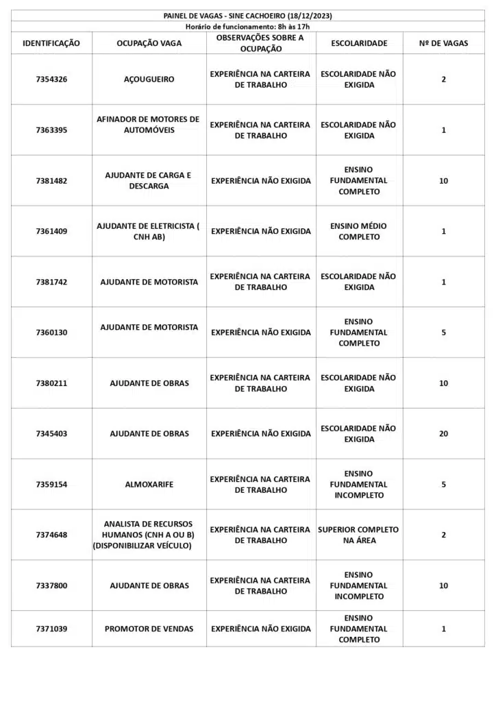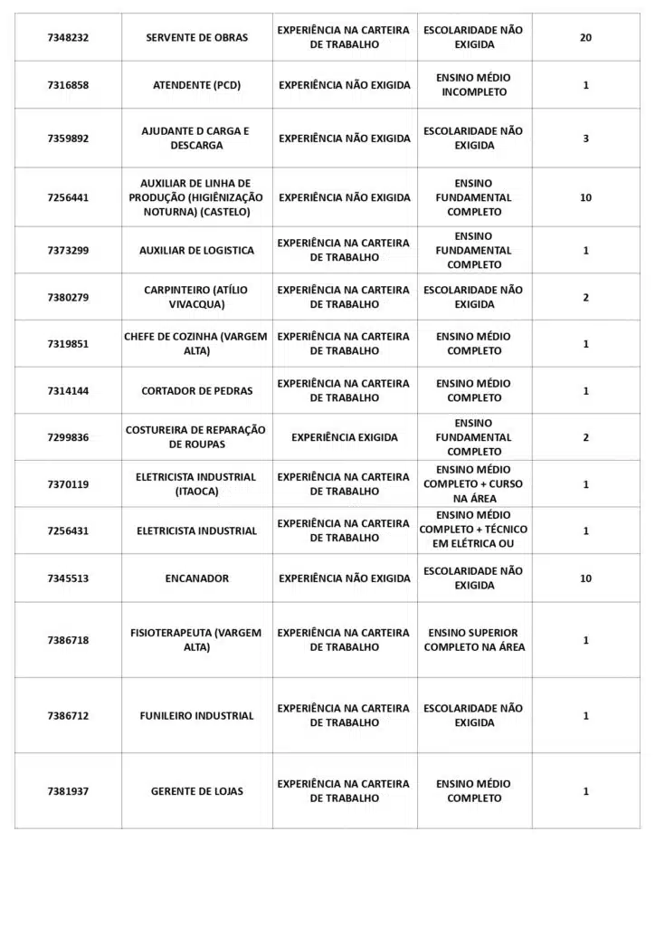 As oportunidades de emprego são para diversos cargos e níveis de escolaridade e para cidades do Sul do ES. No entanto, é preciso fazer um cadastro no Sine Cachoeiro para concorrê-las.