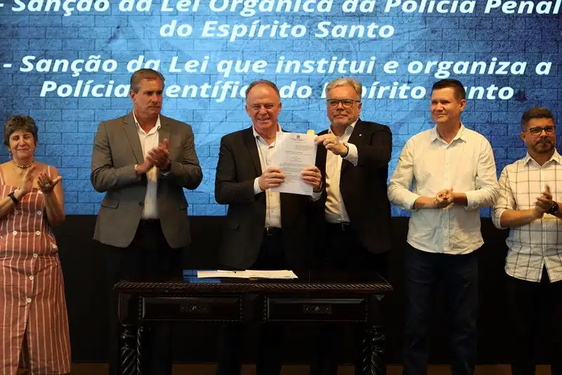 O governador do Estado, Renato Casagrande, sancionou, nesta segunda-feira (18), as leis complementares que estabelecem a Polícia Científica do Espírito Santo (PCIES) e que institui a Lei Orgânica da Polícia Penal do Espírito Santo (PPES). A cerimônia aconteceu no Palácio Anchieta, em Vitória, com a presença de autoridades e representantes das categorias.