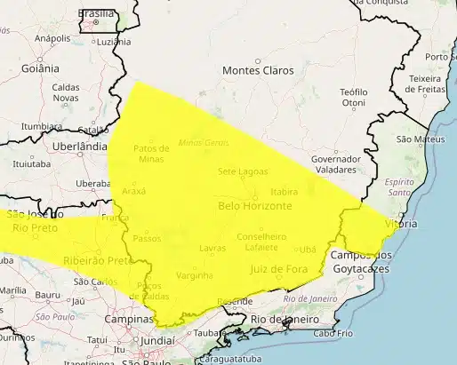 Com grau de severidade de perigo, o alerta é válido até às 10h desta quarta-feira (20), e prevê chuva entre 30 e 60 mm/h ou 50 e 100 mm/dia, ventos intensos (60-100 km/h), e queda de granizo, com risco de corte de energia elétrica, estragos em plantações, queda de árvores e de alagamentos.