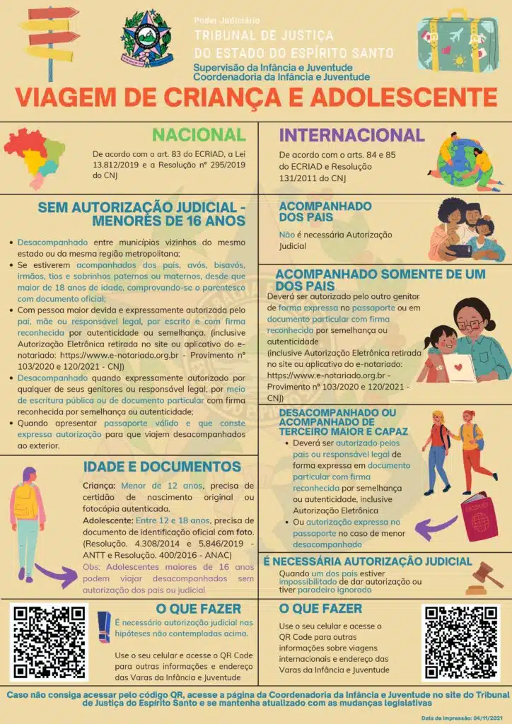De acordo com o Tribunal de Justiça do Estado do Espírito Santo (TJES), nenhuma criança ou adolescente, menor de 16 anos, poderá viajar para fora da Comarca onde reside desacompanhado dos pais ou dos responsáveis sem expressa autorização judicial.