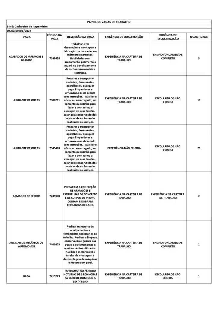As oportunidades de emprego são para diversos cargos e níveis de escolaridade. No entanto, é preciso fazer um cadastro no Sine Cachoeiro para concorrê-las.