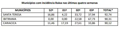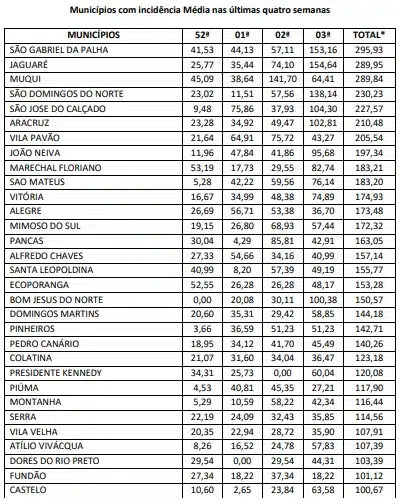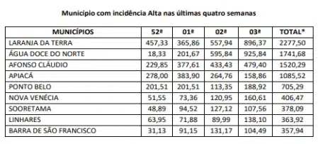 De acordo com o boletim, o município capixaba com a maior incidência é Laranja da Terra, localizado na região metropolitana de Vitória, com um total acumulado de 2.277,50, nas últimas quatro semanas e o menor é Baixo Guandú, com um acumulado de 22,48.
