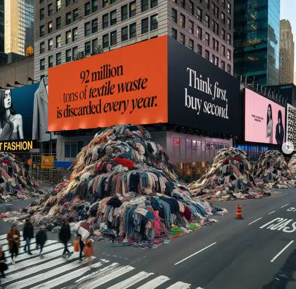 Neste ínterim, um dos grandes nomes da revenda de moda do mundo Vestiaire Collective lançou uma campanha em que, por meio de imagens criadas com recurso a inteligência artificial, pontos turísticos são cercados de montes de roupa. Aliás, além da Torre Eiffel, as imagens mostram o Empire State Building, da Times Square, o Palácio de Buckingham, a Torre de Televisão de Berlim (com 368 metros de altura), o Coliseu de Roma e o resort Marina Bay Sands, de Singapura. O objetivo é alertar para o desperdício da indústria da moda.