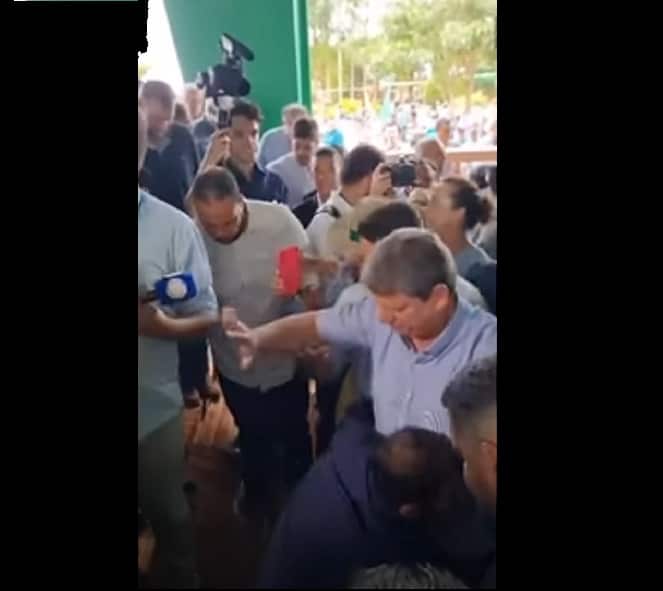 O governador de São Paulo, Tarcísio de Freitas (Republicanos), levou um susto nesta terça-feira, (23), durante agenda em uma feira agropecuária na cidade de Cândido Mota.