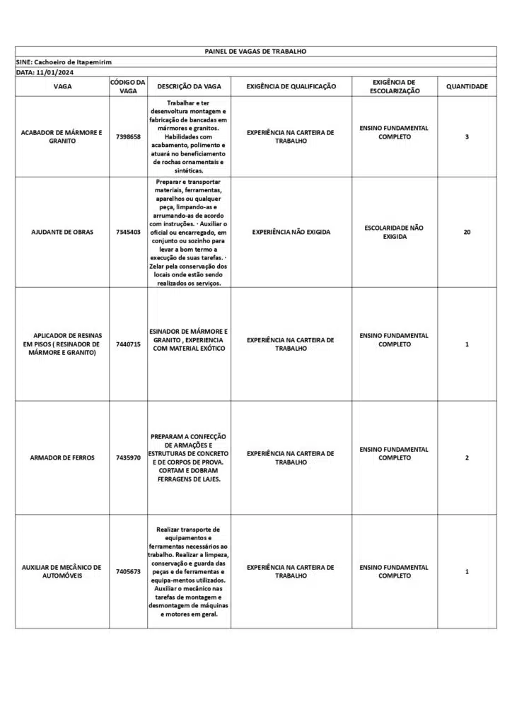 As oportunidades de emprego são para diversos cargos e níveis de escolaridade e para cidades do Sul do ES. No entanto, é preciso fazer um cadastro no Sine Cachoeiro para concorrê-las.