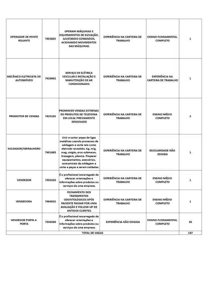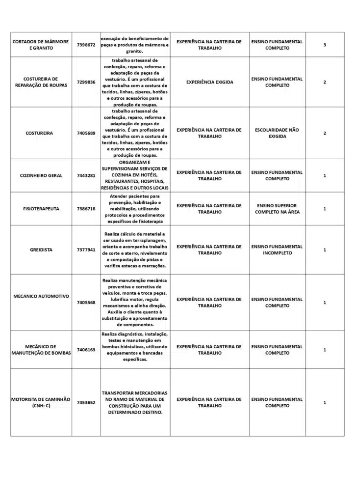 As oportunidades de emprego são para diversos cargos e níveis de escolaridade
