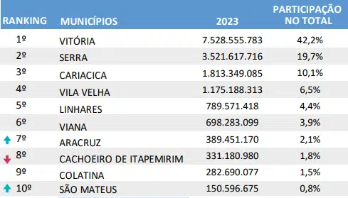 Apesar da redução, a Capital Secreta permanece entre os dez maiores do Estado, atrás apenas de Aracruz, com R$ 389.451.170; Viana, com R$ 698.283.099; Linhares, com R$ 789.571.418; Vila Velha, com R$ 1.175.188.313; Cariacica, R$ 1.813.349.085; Serra, R$ 3.521.617.716, e Vitória, com R$ 7.528.555.783, sendo a primeira do ranking.