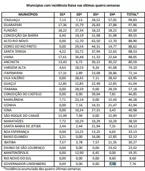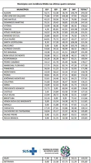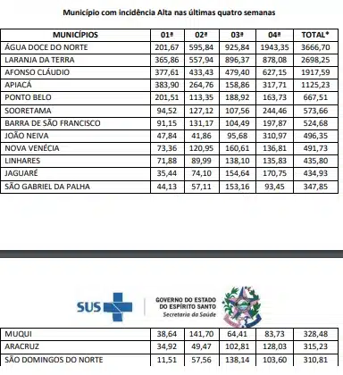De acordo com este boletim, o município capixaba com a maior incidência é Água Doce do Norte, que nesta semana, contabilizou 1943,35. e o menor é Governador Lindenberg, que na semana anterior nao tinha registro algum, agora está com 7,76.
