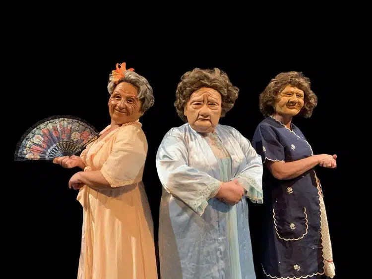 “Janelas” é um espetáculo de máscaras inteiras expressivas. A linguagem das máscaras teatrais utiliza códigos corporais, com movimentos, gestos e ações físicas para se expressar. Quando são meias-máscaras, cobrem metade do rosto deixando a boca livre para falar, mas quando são inteiras, como as que utilizamos, não se comunicam através das palavras. Por este motivo, o que mais nos atrai neste tipo de espetáculo é o modo como cada máscara faz as coisas e como reage ao que faz, ao que vê e ao que ouve.