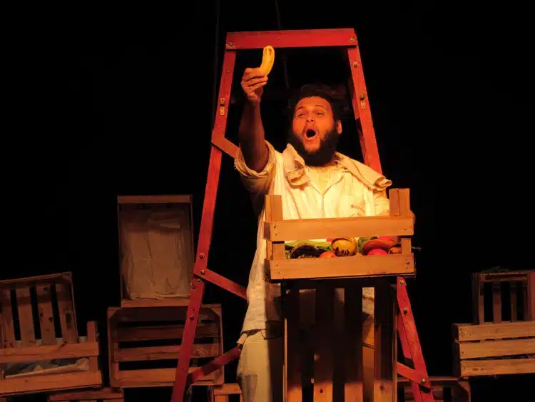 Em “A História das Coisas”, a origem dos objetos é encenada de forma lúdica, na medida em que o corpo é parte preponderante da cena, propondo uma escrita dramatúrgica que descreve relações espaciais e temporais, ações físicas, qualidades de movimento e voz; produzindo uma acoplagem entre palavra e corporeidade, transformando materiais historiográficos em material cênico dramáticos, inscritos em situações que a criança reconhece através da vivência da fruição estética.